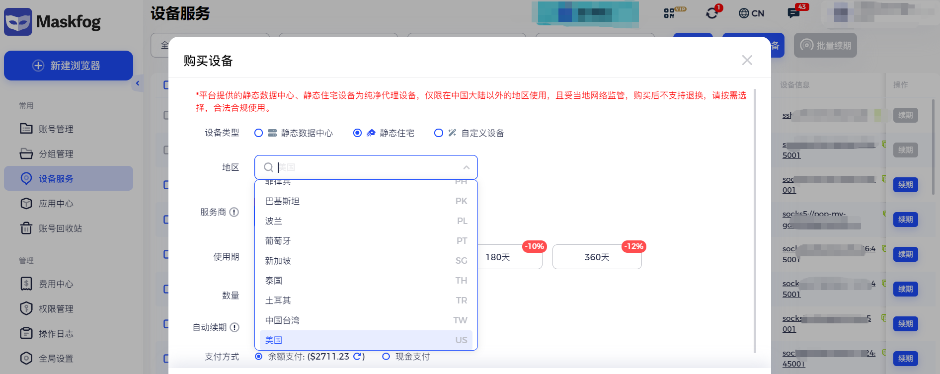尤其是在跨区域管理账号时(例如中国团队管理欧美市场账号),IP 异常最容易触发风控。可以选择绑定Maskfog自带的静态住宅代理或者集成第三方代理平台的代理信息。