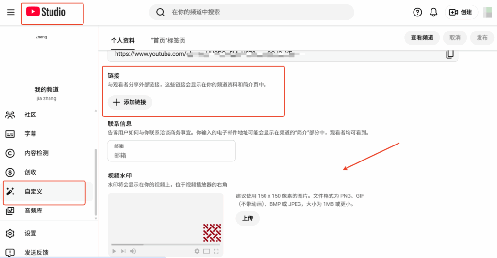YouTube Studio → 自定义 → 基本信息 → 链接 → 添加链接 → 选择“放在频道头图中显示”