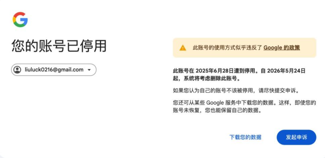 • “违反了政策”: 需要查看具体业务是否违规,查看具体涉及哪项业务(Google Ads、YouTube、Gmail等)的违规,点击【开始申诉】,在申诉理由中强调:“我是个人真实用户,账号由于近期网络环境波动导致误封,我始终遵守 Google 服务条款,该账号包含重要业务数据,请协助人工复核。”