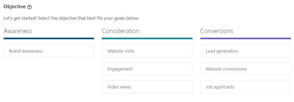 根据目标,选择合适的广告类型。例如:如果你要获取潜在客户,选择“赞助内容+Lead Gen Form”;如果做品牌曝光可选“视频广告”或“动态广告”。
