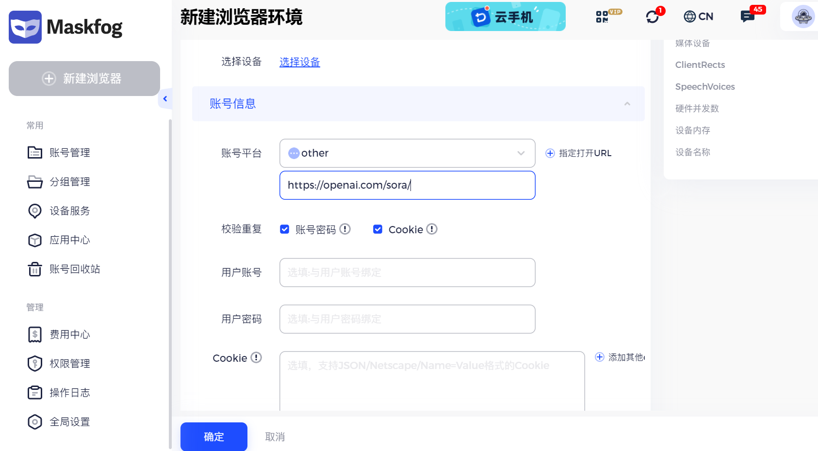 Maskfog指纹浏览器在这里的作用,不只是“防封”,在 Sora 这类高价值 AI 服务中,更重要的是它的另一层作用:为团队提供一个长期稳定、可复用的统一浏览环境。