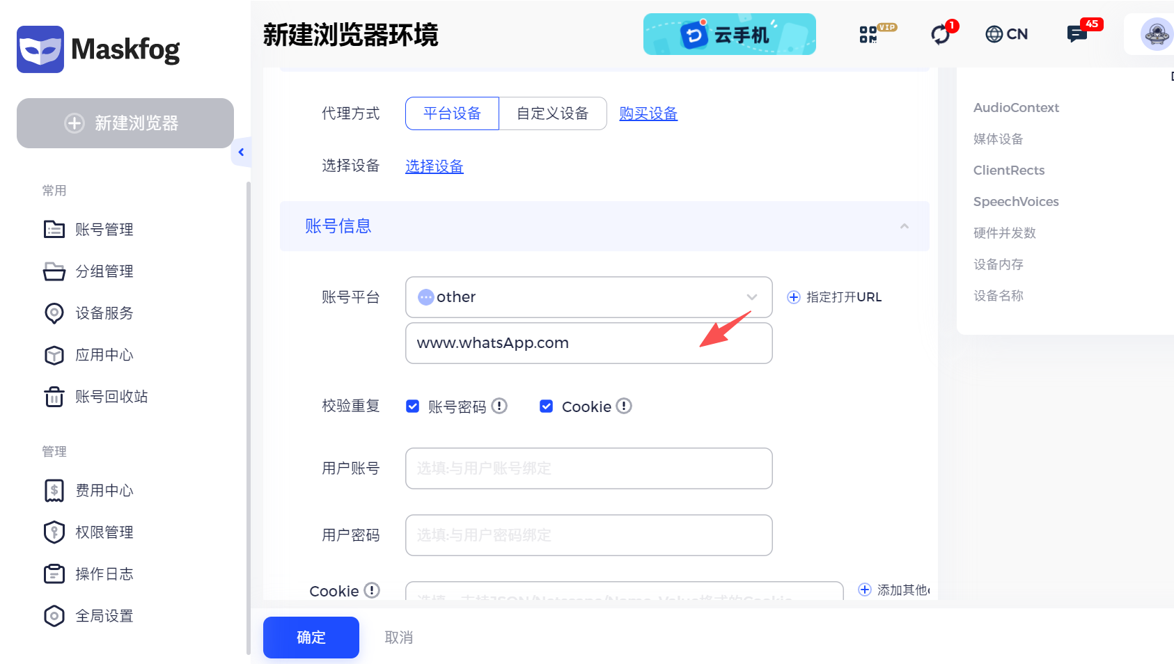 以 Maskfog 为例,可以为每个 WhatsApp 账号创建独立运行环境。