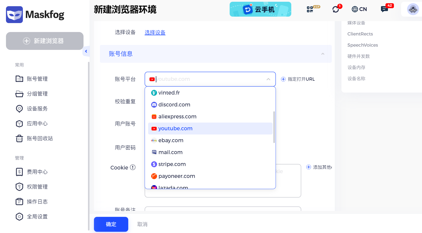 在实际操作中,很多团队会通过指纹浏览器为每个频道创建独立环境,使每个账号拥有不同的设备特征和稳定的使用轨迹。例如使用 Maskfog 指纹浏览器,可以为不同 YouTube 账号建立独立浏览器环境,隔离 Cookie、指纹参数和登录信息,并且Maskfog提供了真实住宅IP设备搭配设备环境,可以全方位降低多账号之间被关联的风险,从而更适合长期规模化运营 Faceless 频道。